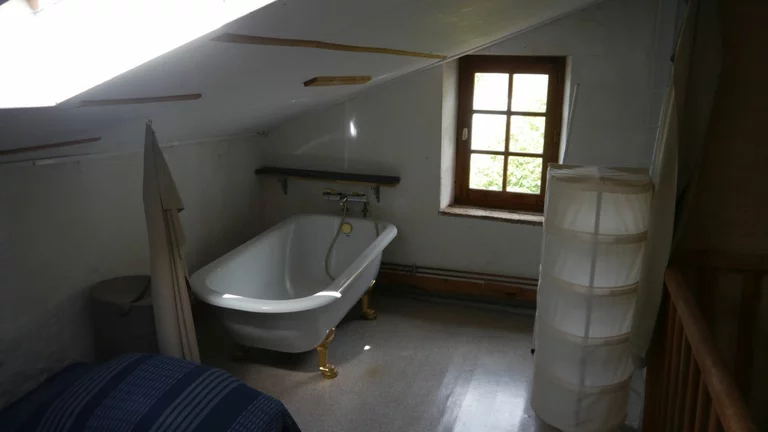 The Nora apartment is located in our holiday home in Champagne, Charente-Maritime, France. It is one of two apartments in this house and is completely independent from the other apartment, even outside. Overall, Nora remains more closely tied to the house's 1861 construction year – the old beamed ceiling in the living room is original, as is the one above the kitchen. The wooden floor in the living room has also been around for many decades, and the previous owner laid a mosaic tile floor in the kitchen from the 1950s. At that time, the Chevallereau family and their two children built a second shower and bath facility in the former stable, next to the sink; the rustic trough, molded directly from concrete, is a testament to this. For this, the old oven had to be removed (unfortunately!); the passageway was created by reducing the size of the old giant fireplace (still visible upstairs). This allowed us to renovate the floor – using pavers from the distillery in St. Jean d'Angély (local, about 10 km away) – and install a toilet and sink, and: voilà, the washing machine. The southern part of the bathroom, now the "technical room," housed the only toilet in the 1950s, a water-saving model. It was soon replaced by a WC in 2000. This toilet is now accessible from the small garden in the technical room and now belongs to Suzanne's apartment.
