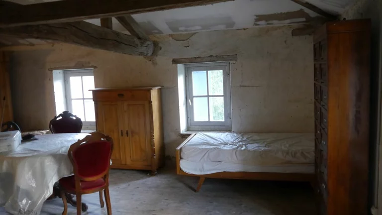 We removed the staircase that led from the existing entrance door in the 1960s, which had been accessed from the outside. This allows the door to open onto the small wooden deck facing east. We then had the staircase to the upper floor built from the kitchen upwards – and were delighted when Madame Chevallereau said: "That's where the staircase to the upper floor was originally!" This made it possible to reach a room above the sink for the bathroom and toilet. Originally, it also served as a bedroom, but now there's a daybed there.