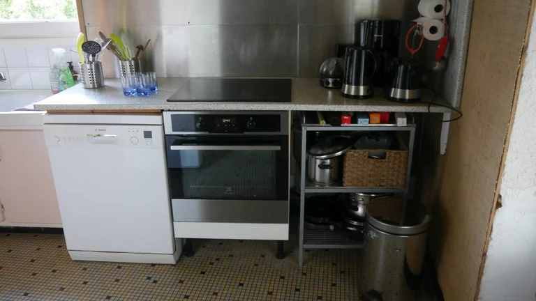 The Suzanne apartment is located in our holiday home in Champagne, Charente-Maritime, France. It is one of two apartments in this house and is completely independent of the second apartment, even outside. From the street, you drive a short distance up the path next to the house to a carport. Opposite, a garden gate leads from the path directly into the garden and onto the terrace (plain in-situ concrete). From there, you enter the apartment into the kitchen, which also serves as a dining room for up to 6 people. The kitchen is well-equipped.
