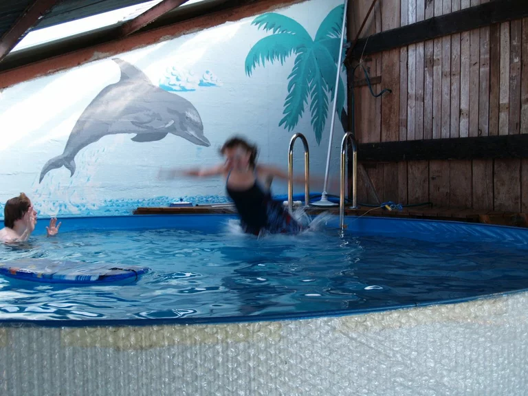 Our holiday home has a beautiful swimming pool. It's a simple, round above-ground pool with a water depth of 1.20 m and a diameter of 5 m. This results in a water surface area of almost 20 square meters (pi*radius^2). The pool is located in a large, open hangar. This has the great advantage of allowing you to have fun in the pool even when it rains—a huge plus for children who might otherwise be a bit impatient!
