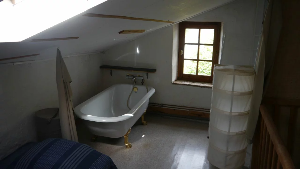 In 2024, we decided to have the attic space above Suzanne's apartment (which had been sound and thermally insulated) insulated as well. This time, all the way up to the roof, with some ceilings reaching 3.5 meters in height. This room is currently still in beautiful, unpainted condition, has plenty of space, and is furnished with two 90 x 190 cm beds and a 160 cm double bed with a metal frame, as well as a large wardrobe, two smaller cabinets, and a table with chairs. The room can accommodate four guests and serve as a playroom, even allowing for relaxing "beam-watching." Nora is an apartment for people who also like "old" things and have a sense of compromise. The reward: there's plenty of space!