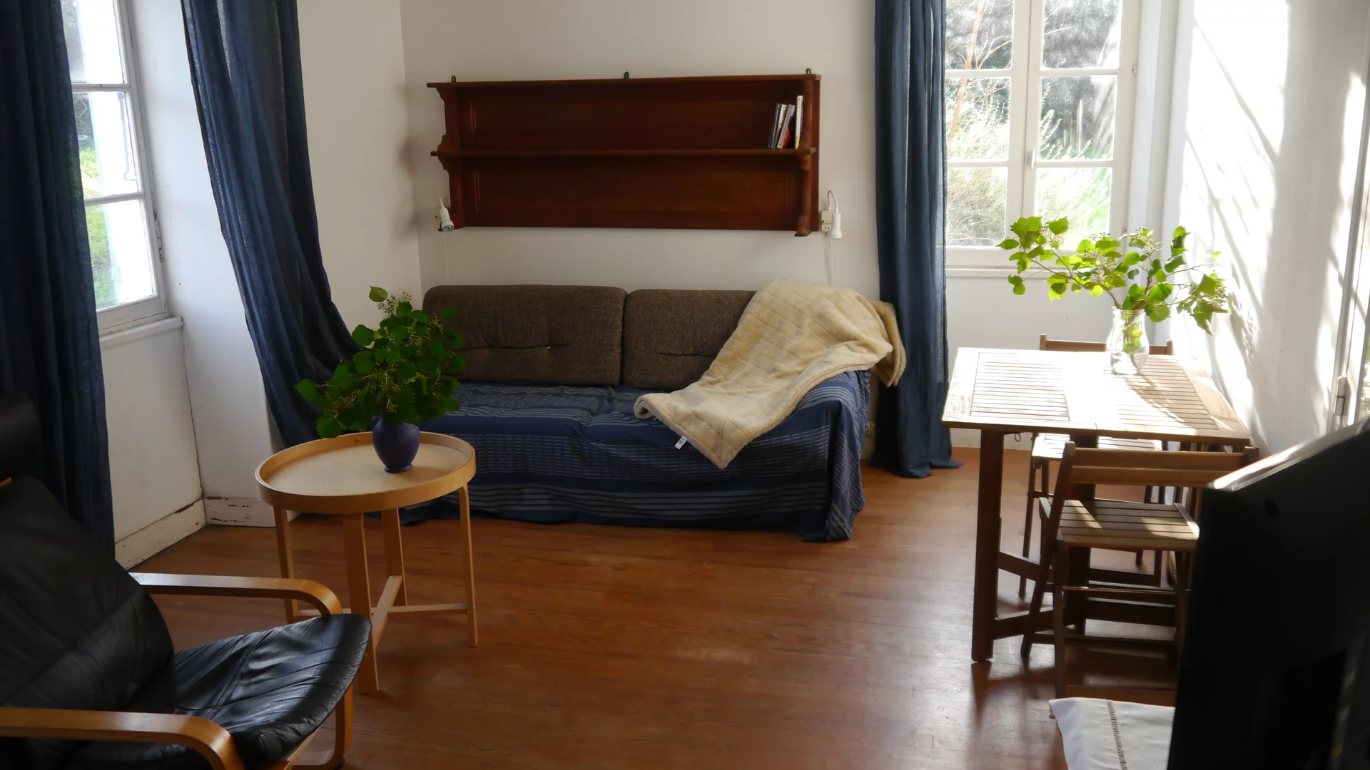 The Nora apartment is located in our holiday home in Champagne, Charente-Maritime, France. It is one of two apartments in this house and is completely independent from the other apartment, even outside. Overall, Nora remains more closely tied to the house's 1861 construction year – the old beamed ceiling in the living room is original, as is the one above the kitchen. The wooden floor in the living room has also been around for many decades, and the previous owner laid a mosaic tile floor in the kitchen from the 1950s. At that time, the Chevallereau family and their two children built a second shower and bath facility in the former stable, next to the sink; the rustic trough, molded directly from concrete, is a testament to this. For this, the old oven had to be removed (unfortunately!); the passageway was created by reducing the size of the old giant fireplace (still visible upstairs). This allowed us to renovate the floor – using pavers from the distillery in St. Jean d'Angély (local, about 10 km away) – and install a toilet and sink, and: voilà, the washing machine. The southern part of the bathroom, now the "technical room," housed the only toilet in the 1950s, a water-saving model. It was soon replaced by a WC in 2000. This toilet is now accessible from the small garden in the technical room and now belongs to Suzanne's apartment.