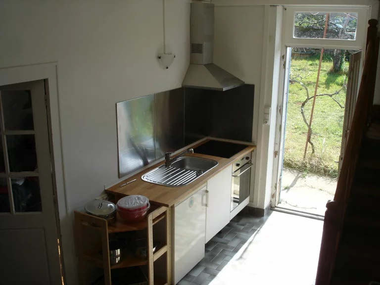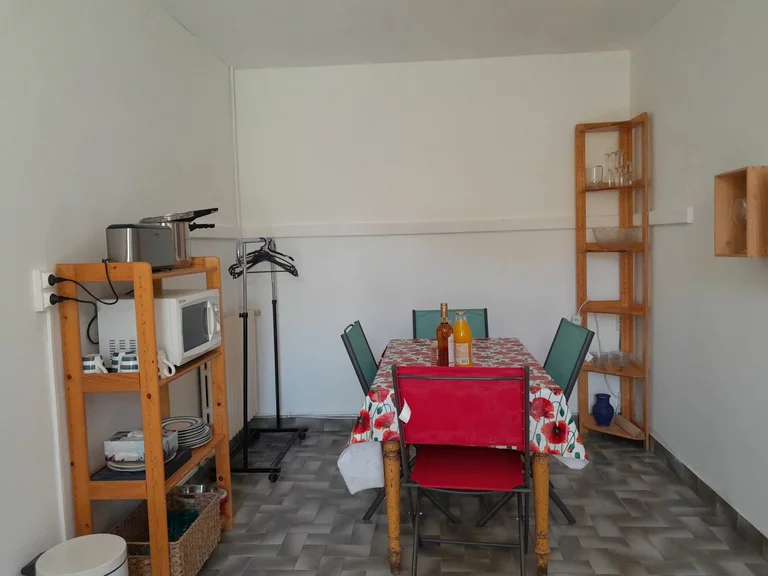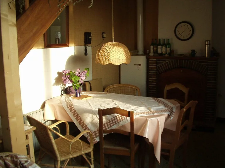 The Suzanne apartment is located in our holiday home in Champagne, Charente-Maritime, France. It is one of two apartments in this house and is completely independent of the second apartment, even outside. From the street, you drive a short distance up the path next to the house to a carport. Opposite, a garden gate leads from the path directly into the garden and onto the terrace (plain in-situ concrete). From there, you enter the apartment into the kitchen, which also serves as a dining room for up to 6 people. The kitchen is well-equipped.