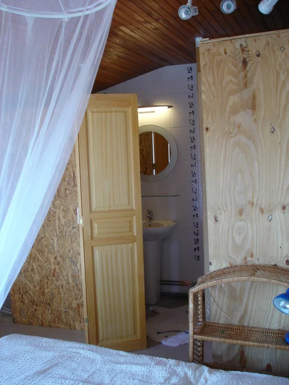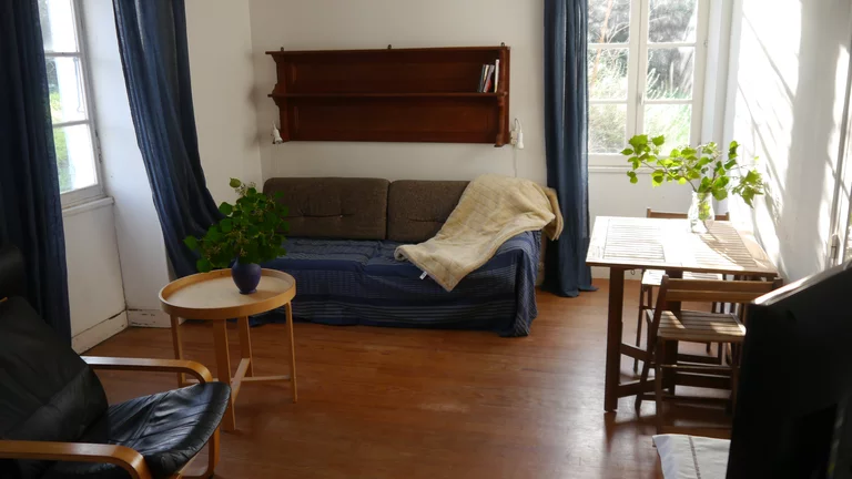 The Nora apartment is located in our holiday home in Champagne, Charente-Maritime, France. It is one of two apartments in this house and is completely independent from the other apartment, even outside. Overall, Nora remains more closely tied to the house's 1861 construction year – the old beamed ceiling in the living room is original, as is the one above the kitchen. The wooden floor in the living room has also been around for many decades, and the previous owner laid a mosaic tile floor in the kitchen from the 1950s. At that time, the Chevallereau family and their two children built a second shower and bath facility in the former stable, next to the sink; the rustic trough, molded directly from concrete, is a testament to this. For this, the old oven had to be removed (unfortunately!); the passageway was created by reducing the size of the old giant fireplace (still visible upstairs). This allowed us to renovate the floor – using pavers from the distillery in St. Jean d'Angély (local, about 10 km away) – and install a toilet and sink, and: voilà, the washing machine. The southern part of the bathroom, now the "technical room," housed the only toilet in the 1950s, a water-saving model. It was soon replaced by a WC in 2000. This toilet is now accessible from the small garden in the technical room and now belongs to Suzanne's apartment.