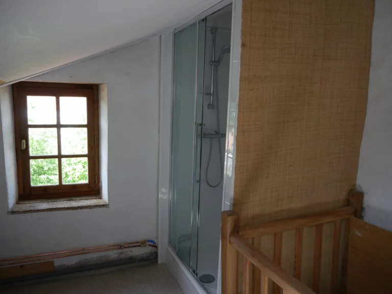 In the kitchen-dining room, there is a storage room under a small staircase that leads up to the bedroom with a west-facing window, also with an external shutter. The room has two beds, each measuring 80 x 190 cm, and a built-in wardrobe and linen closet, a small chest of drawers, and a desk with an armchair. Through the bedroom, you reach the shower room with a sink, shower, and toilet, with a fan-assisted ventilation system to the outside. Suzanne's residents also have access to a second toilet with a sink, as well as a washing machine in the utility room (well cistern, electricity meter/fuses), which is directly accessible from the garden.